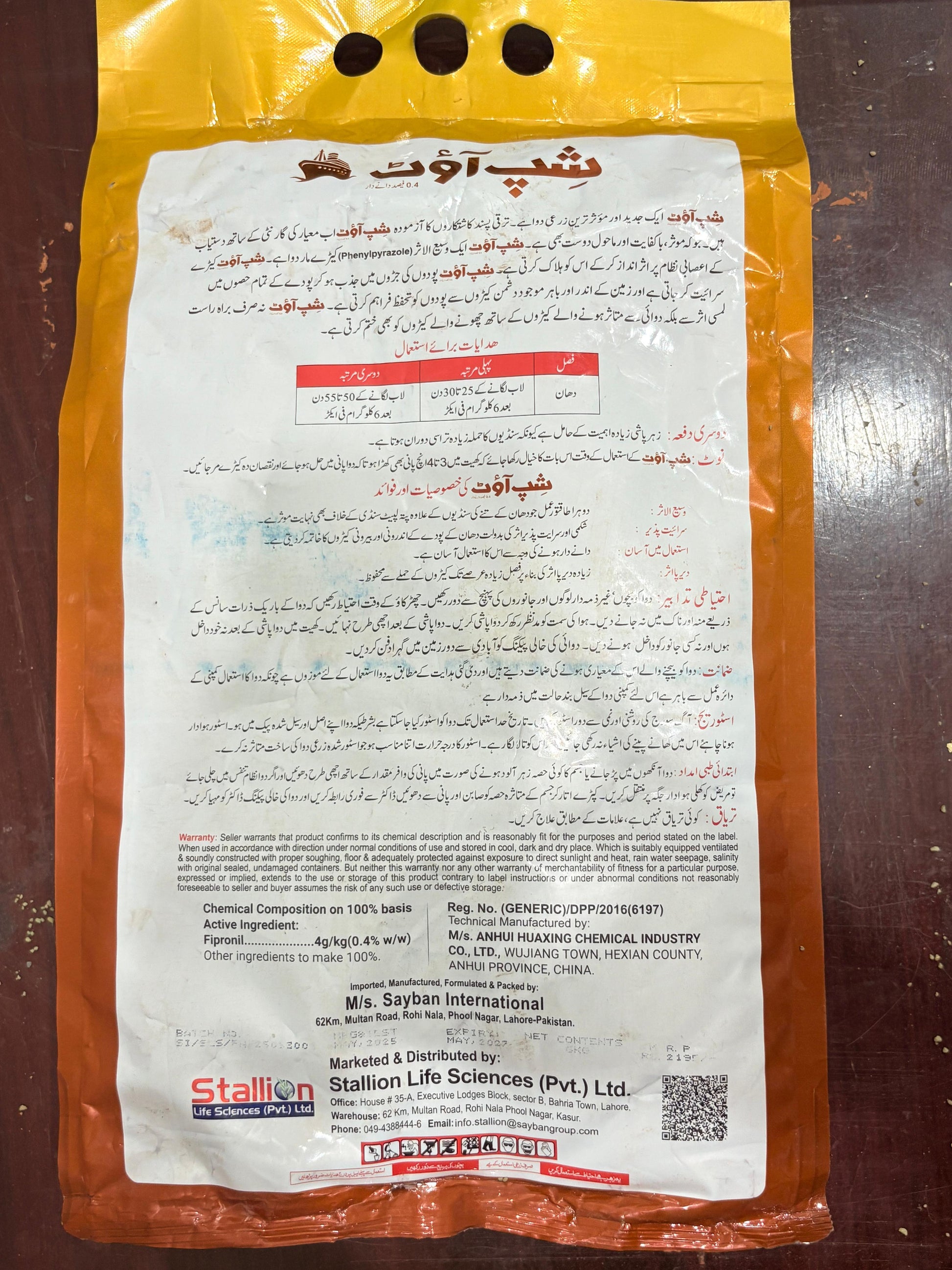 Ship Out is a highly effective insecticide specifically formulated for controlling harmful pests in rice fields. With Fipronil as its active ingredient, it provides reliable protection against stem borers and leaf folders, ensuring healthy crop growth and increased yield potential. Its advanced formulation offers long-lasting effectiveness and ease of application, making it an ideal choice for farmers.