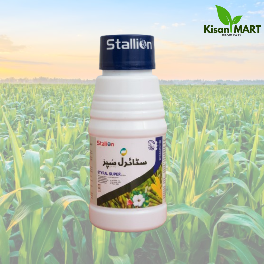 اسٹائرل سپر (سسپنشن کنسنٹریٹ – SC) ایک جدید کیڑے مار دوا ہے جس میں کلورانٹرانیلیپروول 9% اور ایما میکٹن بینزوایٹ 2.6% شامل ہیں، جو مجموعی طور پر 11.6% فعال اجزاء پر مشتمل ہے۔ یہ دوہرا طریقۂ اثر رکھتی ہے—کلورانٹرانیلیپروول کیڑوں کے پٹھوں کے کیلشیم توازن کو بگاڑ کر مفلوج کرتا ہے جبکہ ایما میکٹن اعصابی نظام پر اثر انداز ہو کر تیز اور دیرپا کنٹرول فراہم کرتا ہے۔ اسٹائرل سپر کپاس، مکئی، چاول، سبزیوں اور دالوں میں سنڈیوں کے خلاف مؤثر تحفظ دیتی ہے اور صحت مند بڑھوتری کے ساتھ زیادہ پیداوار کو یقینی بناتی ہے۔